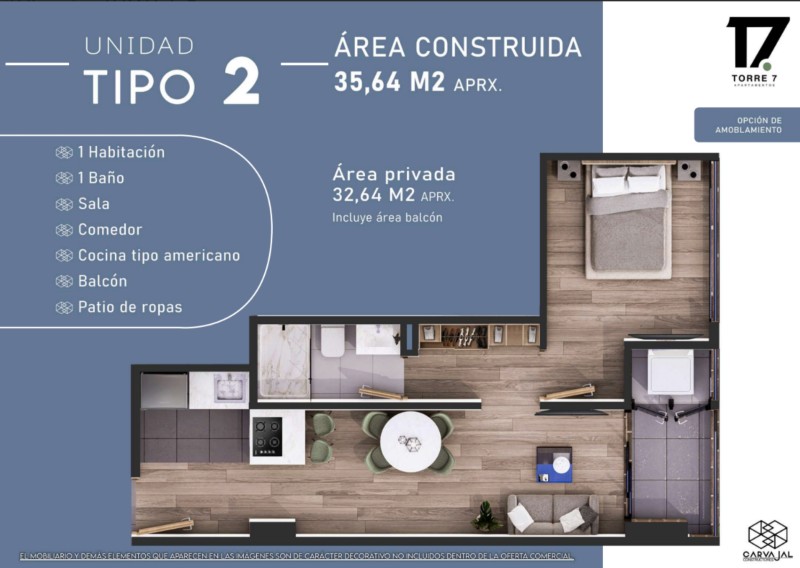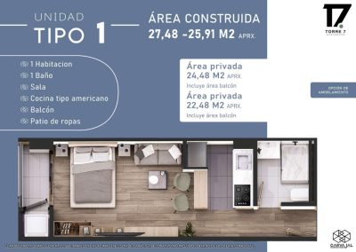 Este acogedor apartamento de 1 habitación y 1 baño cuenta con una cómoda sala integrada a una moderna cocina Tipo americano. Su balcón y el patio de ropas ofrecen practicidad y un espacio ideal para disfrutar de la tranquilidad del hogar. ¡Diseñado para tu comodidad y estilo de vida!